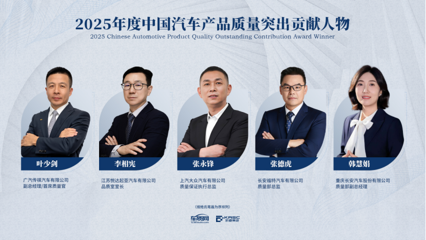 经过六个月的深入调研,五位佼佼者获得2025年度中国汽车产品质量突出贡献人物奖。他们分别是:广汽传祺汽车有限公司副总经理/首席质量官叶少剑,江苏悦达起亚汽车有限公司品质室室长李相宪,上汽大众汽车有限公司质量保证执行总监张永锋,长安福特汽车有限公司质量部总监张德虎,重庆长安汽车股份有限公司质量部副总经理韩慧娟。他们凭借创新的质量管理方法,成功推动了企业从单纯的产品质量向全方位用户体验的升级。