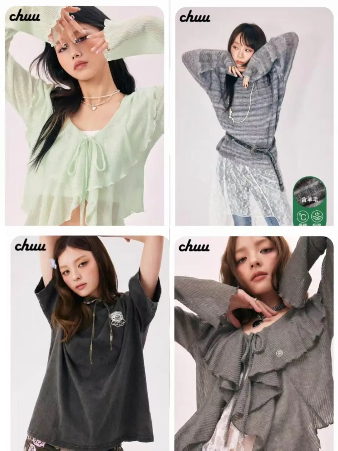 chuu的模特则偏爱把手臂举到肩膀以上,身体略微扭转,让人看不准衣服的实际穿着情况。