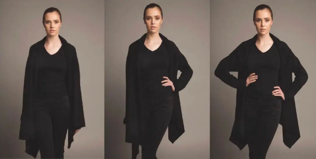 特别是模特需要展示宽松、纯色衣物的时候,身体的各部分很难被区分开,视觉上人和衣物就像“一整片”,这时候再好的身材和曲线都被遮盖了,往往需要通过手臂摆放等技巧来得到凸显。