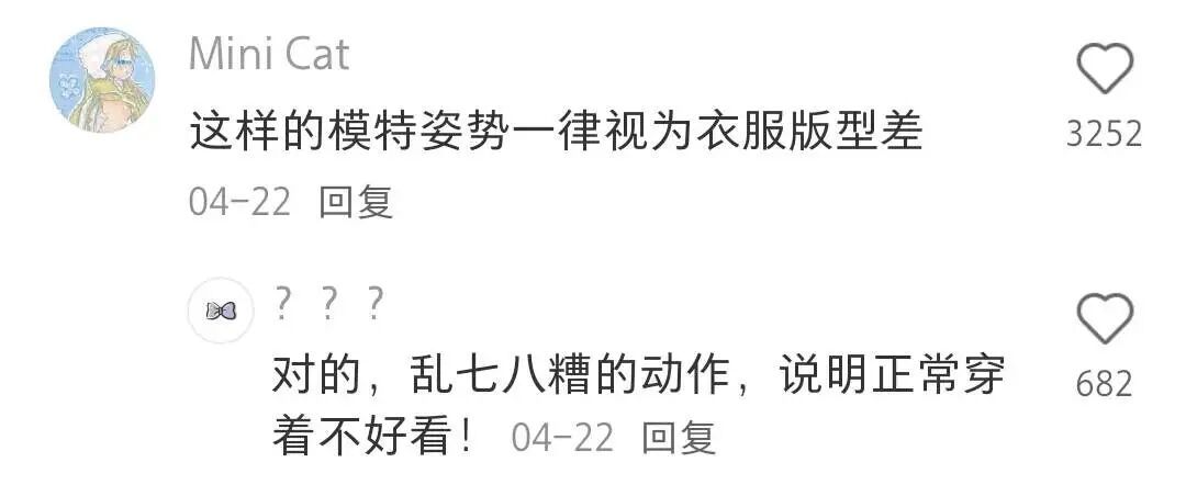 对此,有网友就表示,那些姿势奇怪的模特图,大多是为了掩饰衣服的设计、板型缺陷,“乱七八糟的动作,说明正常穿着不好看”。
