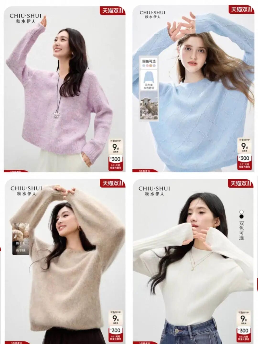 如秋水伊人的模特在展示纯色服装的时候,姿势或是举起一只手,或是双手举到下巴,或是双手举过头顶,总之手总是要举起来。