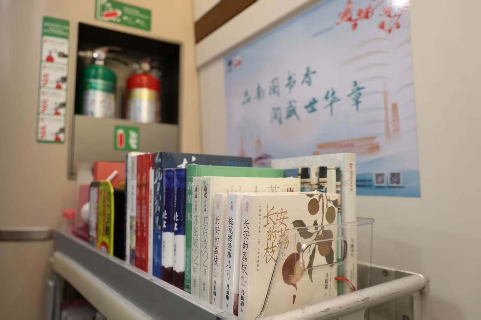 登上G3786次列车,一股书卷气扑面而来。车厢连接处,精心设计的阅读主题海报吸引着旅客目光;抬眼望去,“广铁悦读”小程序的二维码在车厢内随处可见;餐车一隅的图书角里,“铁路悦读好书榜”推荐的书籍整齐摆放,静候读者。“嘿,这个好!坐车还能免费看这么多书,路上就不怕无聊了。”乘车的李女士刚坐下就掏出手机扫码进入数字阅读平台,开启了阅读之旅。
